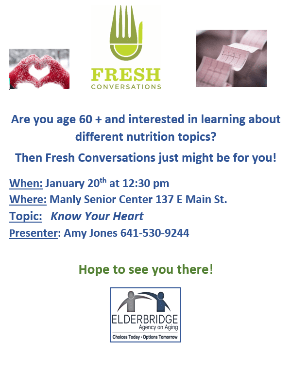 « All Events This event has passed. Fresh Conversations at Manly Senior Center on Janaury 20 at 12:30 PM January 20 @ 12:30 pm - 1:00 pm « Fresh Conversations in Northwood on January 20th at 12:15 PM to 12:45 PM Fresh Conversations at Deercreek Apartments in Fort Dodge January 21at 11:45 AM » Add to calendar Google Calendar iCalendar Outlook 365 Outlook Live Details Date: January 20 Time: 12:30 pm - 1:00 pm